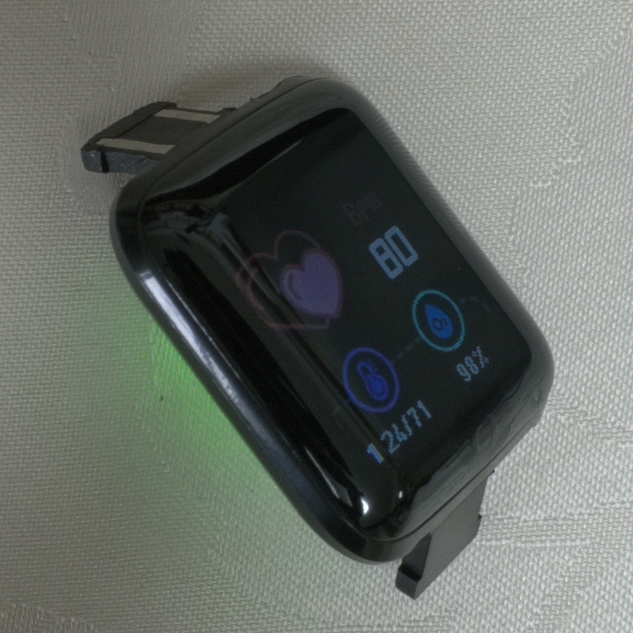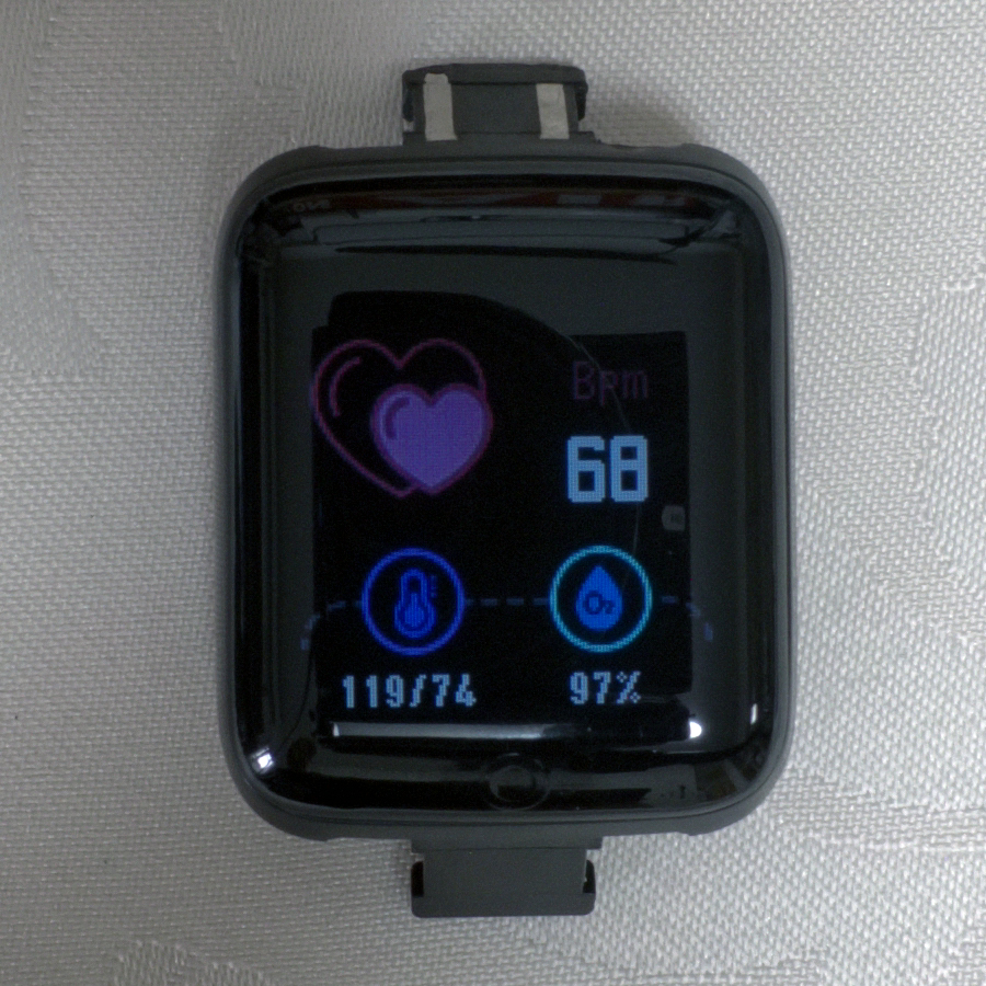 ◎を長押しすると裏側が緑色に点滅し測定のような動作をするが、腕に装着していない状態でも、それっぽい値が表示されるので、適当な数字を表示しているだけではないかと思われる。